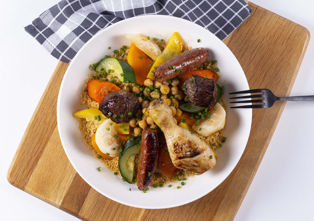 Couscous Bestial: poulet, boeuf, merguez, légumes mijotés et semoule
